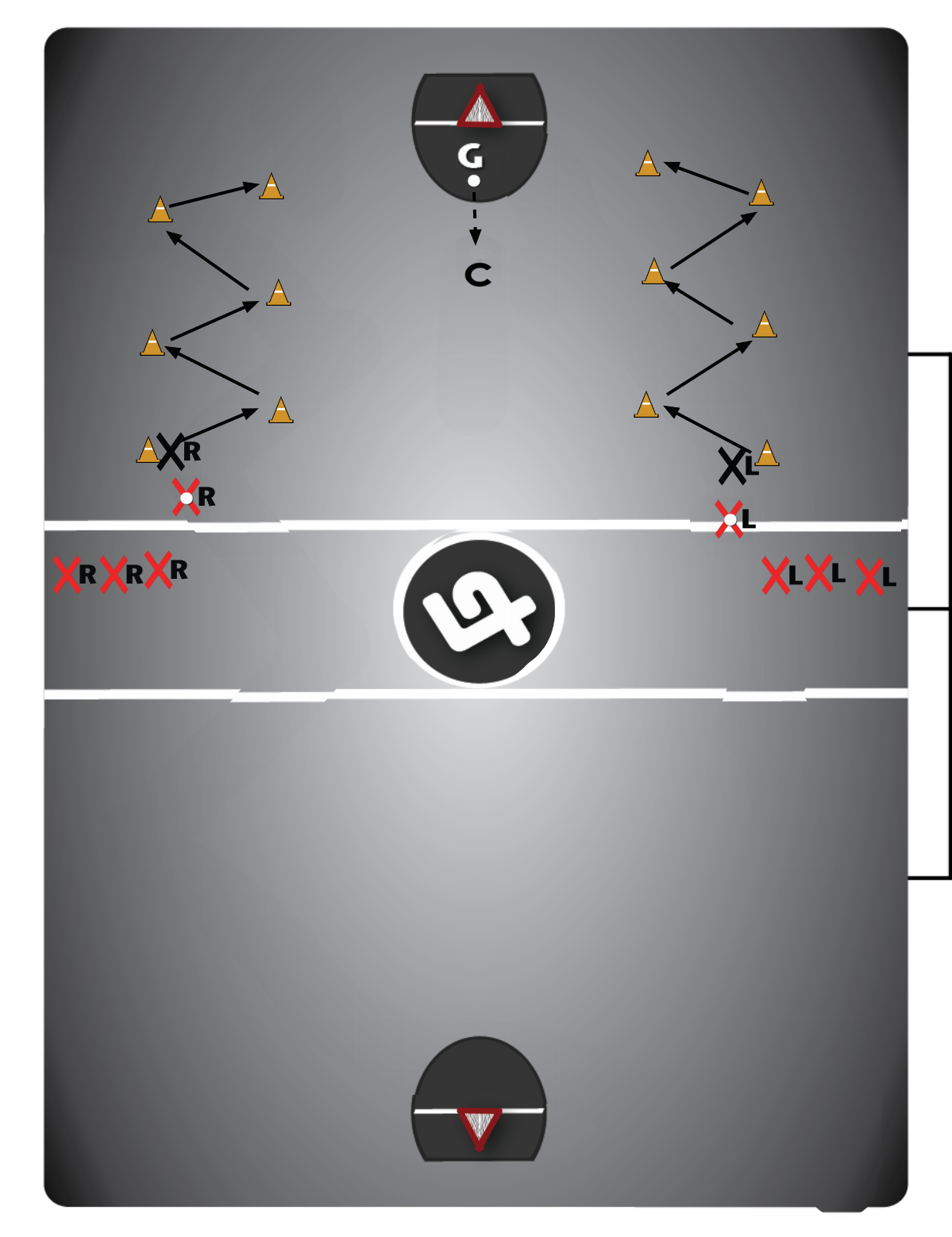 QkVHSU5ORVIgIA0KRGVtbyAoMSBtaW4pOiAgIkJhY2twZWRhbGluZywiICJEcm9wLVN0ZXBwaW5nLCIgIlNpZGUtU2h1ZmZsaW5nLCIgIlRyYWNraW5nIg0KDQpTZXQgdXAgdGhlIGRyaWxsIGJ5IGRpdmlkaW5nIHRoZSBmbG9vciBpbiBoYWxmLCBlaXRoZXIgbGVuZ3Rod2lzZSAoYWR2YW5jZWQgcGxheWVycykgb3Igd2lkdGgtd2lzZSAoYmVnaW5uZXIvaW50ZXJtZWRpYXRlKSwgaGF2aW5nIHBsYXllcnMgYmVnaW4gaW4gbGluZXMgaW4gb3Bwb3NpdGUgZW5kcy9jb3JuZXJzIG9mIHRoZSBmbG9vciAobGVuZ3Rod2lzZSksIG9yIGFsbCBvbiB0aGUgc2FtZS1zaWRlICh3aWR0aC13aXNlKS4gIEZvciBiZWdpbm5lcnMsIHRoaXMgZHJpbGwgY2FuIGFsc28gYmUgc2V0IHVwIHVzaW5nIGhhbGYgb2YgdGhlIGZsb29yIGFuZC9vciBweWxvbnMgYXMgbWFya2VycyBmb3IgcGxheWVycyB0byBwcmFjdGljZSAiZHJvcC1zdGVwcGluZyIgYW5kICJzaWRlLXNodWZmbGluZyIgZWl0aGVyIHRvIG9yIGFyb3VuZDsgYmVpbmcgc3VyZSB0byBrZWVwIHRoZWlyIGhlYWQgb24gYSBzd2l2ZWwuDQoNCipWYXJpYXRpb24gIzEgKDUgbWluKTogICJEZWZlbmRlciBGb290d29yayBPbmx5LiIgIE9uZSBwbGF5ZXIgYWZ0ZXIgdGhlIG90aGVyIHByYWN0aWNlcyAidHJhY2tpbmciIGJhY2t3YXJkLCBhbGwgdGhlIHdheSBkb3duIHRoZSBmbG9vciAobm8gYmFsbCBjYXJyaWVyKSBhdCBhIGNhZGVuY2Ugb2YgMiBkcm9wLXN0ZXBzIG9uZSB3YXk7IDIgZHJvcC1zdGVwcyB0aGUgb3RoZXIgKFZhcmlhdGlvbiAjMUEpLiAgVGhlIG5leHQgcGxheWVyIGluIGxpbmUgc2hvdWxkbid0IGdvIHVudGlsIHRoZSBwbGF5ZXIgYWhlYWQgb2YgdGhlbSBpcyBoYWxmd2F5IHRvIHRoZSBmaXJzdCByZXN0cmFpbmluZyBsaW5lLiAgQWR2YW5jZWQgcGxheWVycyBjYW4gYWxzbyBwcmFjdGljZSB0cmFja2luZyBiYWNrd2FyZCBhdCBhIGNhZGVuY2Ugb2YgMyBkcm9wLXN0ZXBzIG9uZSB3YXkgYW5kIDEgZHJvcC1zdGVwIHRoZSBvdGhlcjsgb3IgNCBkcm9wLXN0ZXBzIG9uZSB3YXkgYW5kIDIgdGhlIG90aGVyIChWYXJpYXRpb24gIzFCKS4NCg0KKlZBUklBVElPTiAjMyAoNSBNSU4pOiAiRk9PVFdPUksgKyBDSEVDS0lORyINCipWYXJpYXRpb24gIzMgKDUgbWluKTogIkZvb3R3b3JrICsgQ2hlY2tpbmcuIiBTYW1lIGFzIHRoZSBhYm92ZSB2YXJpYXRpb24sIGV4Y2VwdCBkZWZlbmRlcnMgc2hvdWxkIHBsYWNlIGNyb3NzLWNoZWNrcyAob3IgYm9keSBjaGVja3MpIG9uIHRoZSBiYWxsIGNhcnJpZXIncyBlbGJvd3Mgd2hlcmUgcG9zc2libGUgKHdpdGhvdXQgImx1bmdpbmciKSwgYXMgd2VsbCBhcyBwdXQg4oCcc2hvcnTigJ0gc2xhc2hlcyBvbiB0aGUgb2ZmZW5kZXLigJlzIGdsb3Zlcy9zdGljayAoaW4gYSB0aW1lbHkgZmFzaGlvbiB3aGVuIHRoZXkgYXJlIHZ1bG5lcmFibGUpLiBPZmZlbnNpdmUgc2hvdWxkIHByYWN0aWNlIGJhc2ljIGRvZGdlcyB3aGlsZSBwcm90ZWN0aW5nIHRoZSBiYWxsIGFzIGJlc3QgYXMgcG9zc2libGUsIHdpdGggZGVmZW5zaXZlIHBsYXllcnMgYWxsb3dpbmcgdGhlIG9mZmVuc2l2ZSBwbGF5ZXIgdG8gc2hvb3QgYXQgdGhlIGVuZCBvZiB0aGUgZHJpbGwuDQoNCipNb3N0IGNvbW1vbiBlcnJvciA9IGRlZmVuZGVyIG5vdCBnZXR0aW5nIGxvdyB3aGlsZSB0cmFja2luZyBiYWNrd2FyZCBhbmQgbm90IGtlZXBpbmcgdGhlaXIgc3RpY2sgdXANCg0KR29hbGllIHByYWN0aWNlcyB0cmFwcGluZyBhbmQgcGFzc2luZyB0byB0aGUgY29hY2gu