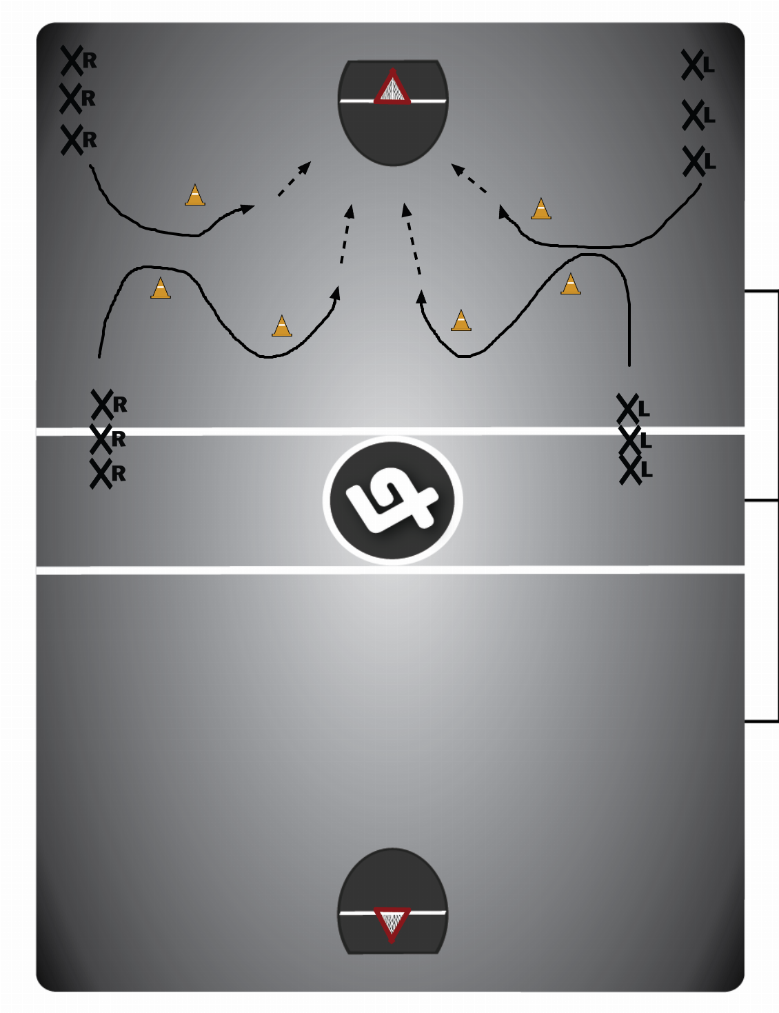 UmlnaHRpZXMgYW5kIExlZnRpZXMgc3RhcnQgaW4gZGlmZmVyZW50IGxpbmVzLCBzdGljayB0byB0aGUgaW5zaWRlLiANCkFsdGVybmF0ZSBzdGFydHMgYXJvdW5kIDIgY29uZXMgYW5kIGluIGZvciBzaG90IG9uIHRoZSBmbHkuIFByb2NlZWQgaW50byBjb3JuZXIgYWZ0ZXIgc2hvdC4gUGFydCAyOyBBZnRlciBhbGwgcGxheWVycyBzaG9vdC4gU3RhcnQgZnJvbSBjb3JuZXIgYXJvdW5kIG9uZSBjb25lIGFuZCBpbiBmb3Igc2hvdC4gUmVwZWF0